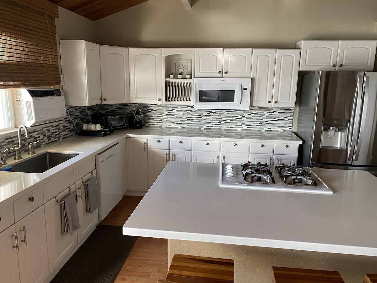The Main House has two Stories on the Upper Levels, all with complete ocean view in all ‘Living’ Areas. ‘Picture in a magazine’ would best describe the comments from travelers at first site upon entering this majestic ‘great room’ and feeling its enchantment. The kitchen centers around an ‘Inner Island’ Stove top/Oven w/bar stool seating for ease in hearing each others latest stories.